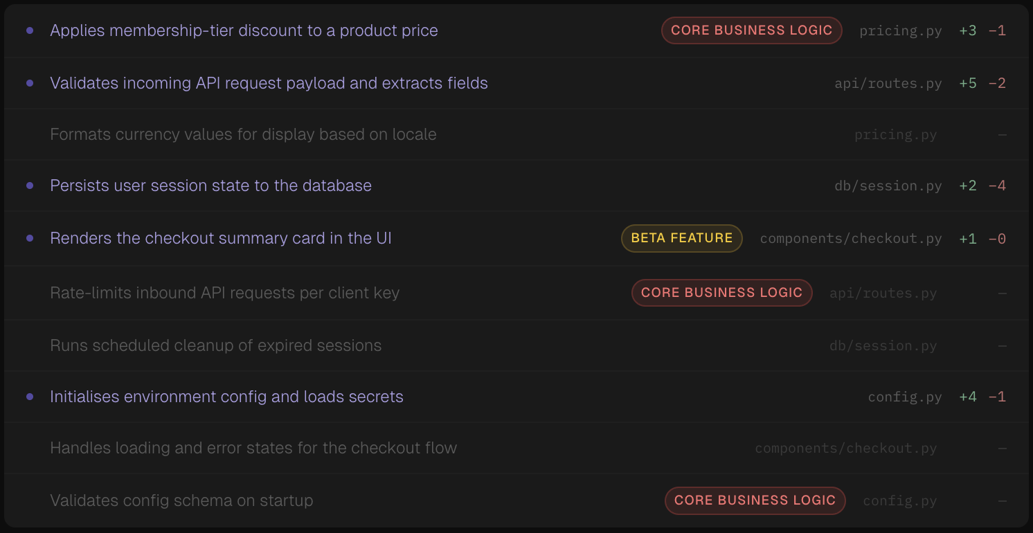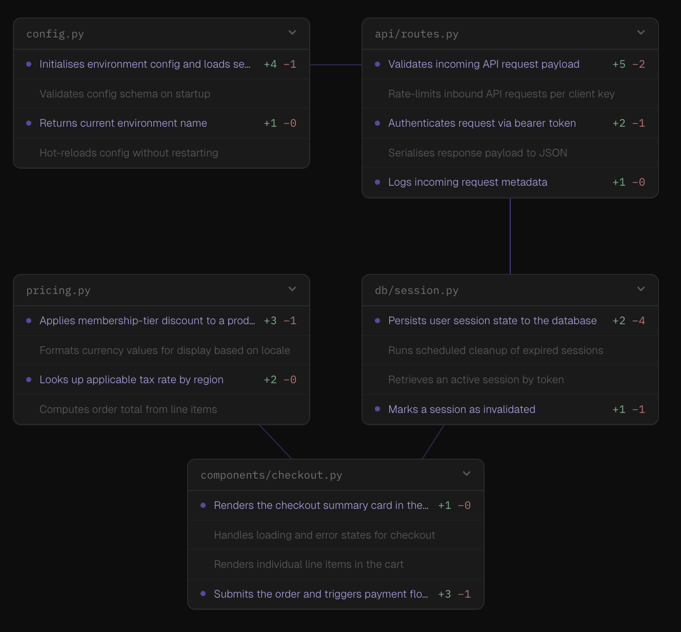 The basic dif interface that we have been using to review human-generated code is still very similar to the interface we are using to review LLM-generated code. This interface feels a lot easier to use when humans were making code changes in (ideally) small, incremental steps. Especially if we are reviewing (or making) these changes, we are already probably baseline familiar with the codebase.